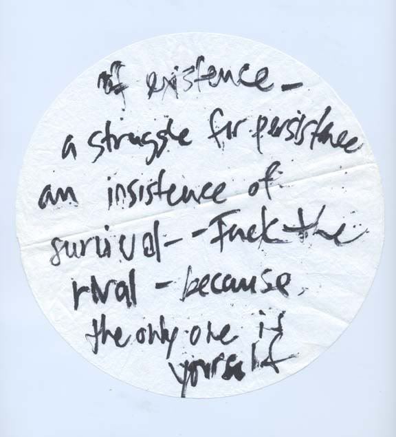 From 1995…. and the 1st time in a public space. I wrote it with a Sharpie on coffee filters….in a frenzied, but straight stream-of-conscious-devil’s-work-of-pen…. cheesy or not…..No cross-outs, no re-writes…..line by line…just as it all fit onto the “pages”….round and unbound….now in a little turnaround…..