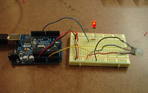 So – basically, when turned on, my luvometer is constantly emitting these annoying little clicky click sounds and the LED flickers. One person holds the white wire and another holds the yellow. While holding the wire in one hand each person holds the other one’s hand – creating a connection. The piezo becomes silent and the LED brightens – resulting in a peaceful and illuminated connection. Well, at least that’s the idea. 🙂