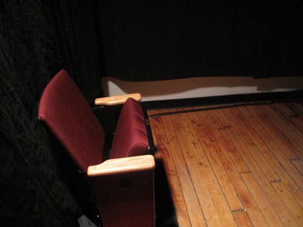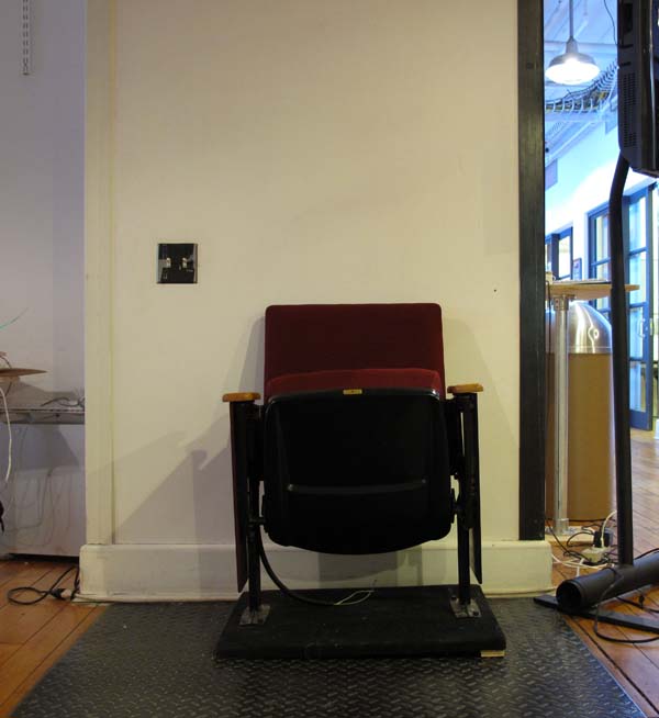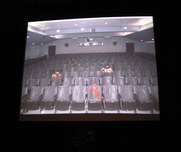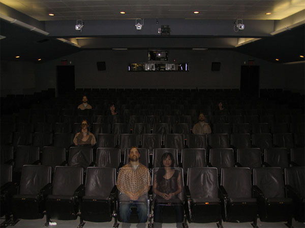 Video installation within a recreated cinema setting that combines live & recorded video. Using projector, screen, theater seat, ambient lighting, four curtains, video camera, audio. Viewer sits in chair triggering lighting fade and video recording. Video feed is composited with recorded video of previous occupants of the seat, transposing the viewer into a virtual audience onscreen. The “virtual” audience will also be semi-transparent (ghost-like), appearing and reappearing randomly in different seats. The video will be accompanied by sound composed of samples of effects and audio from various films.