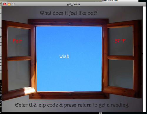 This time, when you enter your zip code – you get the temperature, weather description, city, corresponding poem, and a corresponding image that I randomly plucked from the web.